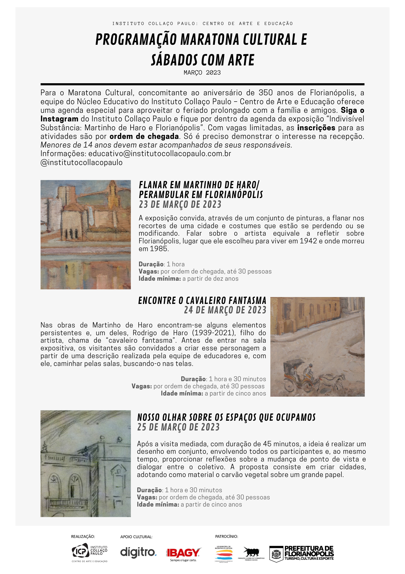 Parceiro da iniciativa, o Instituto Collaço Paulo – Centro de Arte e Educação, se insere na vasta programação da Maratona Cultural, que celebra com arte e cultura o aniversário de 350 anos de Florianópolis. O instituto oferece uma agenda especial com três dias de visitas mediadas e oficinas práticas para aproveitar o feriado. As ações são abertas, gratuitas e com vagas limitadas – 30 pessoas podem participar, atendendo o critério da ordem de chegada. Uma a cada dia, as visitas começam sempre às 15 horas. Menores de 14 anos devem ser acompanhados por seus responsáveis e cada atividade dura em torno de uma hora.