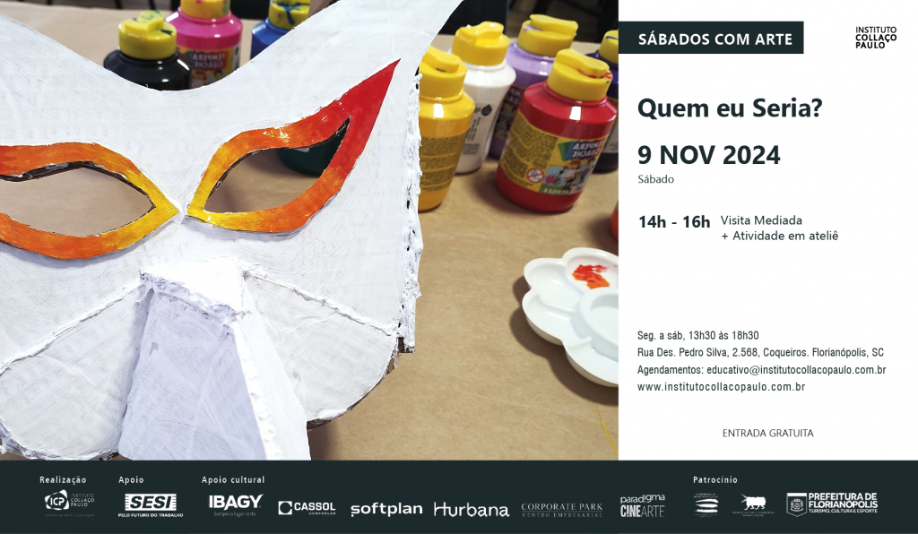 Diante disso, os participantes do Sábados com Arte são convidados a explorar a máscara a partir de conversas em torno das obras do artista Rodrigo de Haro. Após a visita, é desenvolvida a atividade de ateliê. Com uma base de papelão, tinta guache, materiais de ornamentação e cola quente, os participantes podem criar a própria máscara de acordo com sua imaginação e a possibilidade de brincar de ser outro.