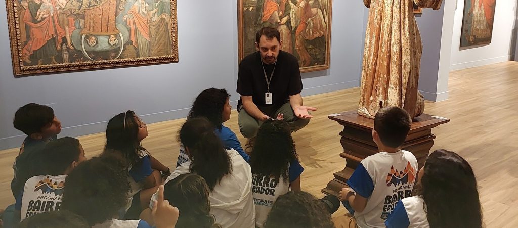 “Exploração Artística: do Percurso à Criação”: parte da obra de Xavier das Conchas, “São João Batista e o Cordeiro” (séc. 18/séc. 19). Após uma conversa sobre o trabalho do artista, os participantes irão se deslocar para a praça em frente ao Instituto para coletar materiais para formular a própria obra. O intuito é criar um ambiente de pesquisa de campo, observando e refletindo sobre os materiais coletados para, no final, exercitar o fazer artístico. Materiais utilizados: diversos materiais, cola branca.