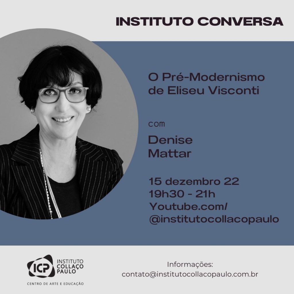 Professora que vive em São Paulo (SP), referência no universo da pesquisa e curadoria de artes visuais no Brasil, Denise Mattar é a convidada do Instituto Conversa, que ocorre de modo virtual, pelo Youtube, no dia 15 de dezembro, às 19h30. Ela falará sobre “O Pré-Modernismo de Eliseu Visconti”, encerrando o conjunto de quatro encontros dentro do programa público que amplia o Plano Educativo do Instituto Collaço Paulo – Centro de Arte e Educação, inaugurado em julho, em Florianópolis (SC). Visconti (1866-1944), um dos mais importantes da Coleção Collaço Paulo e um dos 34 artistas da mostra “Mais Humano: Arte do Brasil de 1950-1930”, está representado com cinco trabalhos: “Raios de Sol”, “A Visita”, “Nu Masculino Sentado com Bastão”, “Retrato de Louise” e “Sem Título”. Aluno de Victor Meirelles (1832-1903) na Academia Imperial de Belas Artes, ele foi estratégico no entre séculos 19 e 20, despontando como precursor na transição do cânone acadêmico para as rupturas do modernismo. A exposição, que tem curadoria de Francine Goudel, fica aberta até 21 de janeiro de 2023. Gratuita, pode ser visitada de segunda a sábado, entre 13h30 e 18h30.