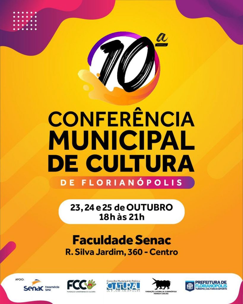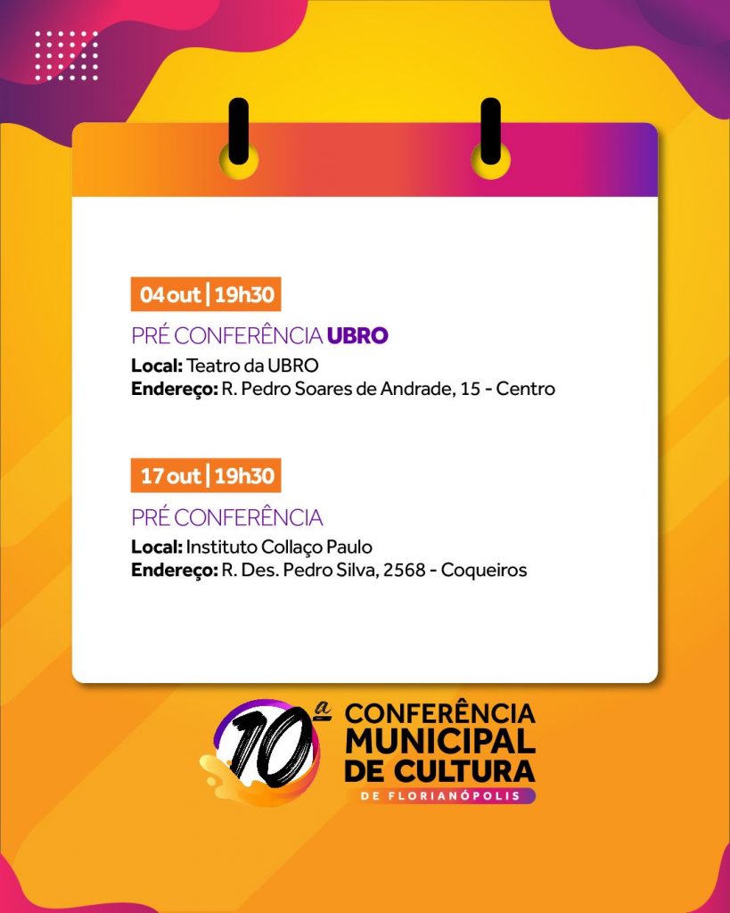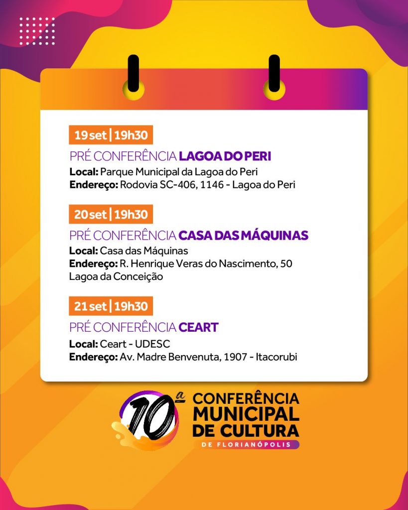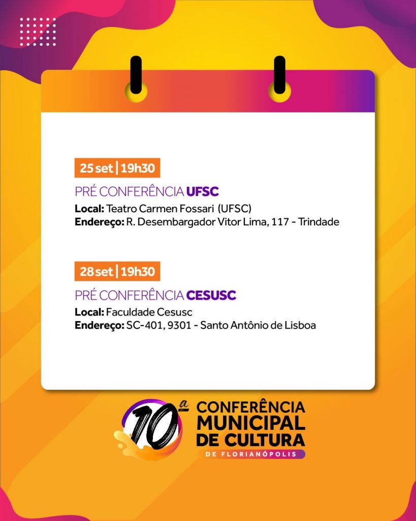 “A pré-conferência é uma oportunidade para entender como se faz a gestão cultural em Florianópolis, conhecer o Conselho Municipal de Política Cultural de Florianópolis e também enviar propostas para serem analisadas durante a Conferência”, diz Roseli Pereira, presidente da FCFFC. Para participar, basta estar presente em um dos eventos do calendário organizado numa perspectiva descentralizada.