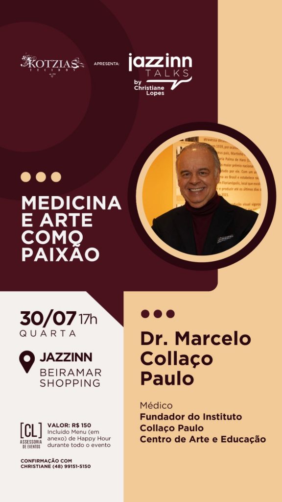 No exato dia em que o Instituto Collaço Paulo – Centro de Arte e Educação completa três anos de existência, instalado na praia do Meio, no bairro Coqueiros, em Florianópolis (SC), o diretor-presidente Marcelo Collaço Paulo é o convidado do Jazzinn Talks, programa comandado por Christiane Lopes Vieira, no Jazzin Gastro Bar. A conversa no dia 30 de julho, a partir das 17 horas, aproxima a medicina e a arte, fundamentos da vida do médico e colecionador que há 40 anos constitui com a mulher, Jeanine Gondin Paulo, a Coleção Collaço Paulo, uma das mais expressivas do Sul do Brasil com obras, em diferentes materialidades e séculos – do 15 ao 21.