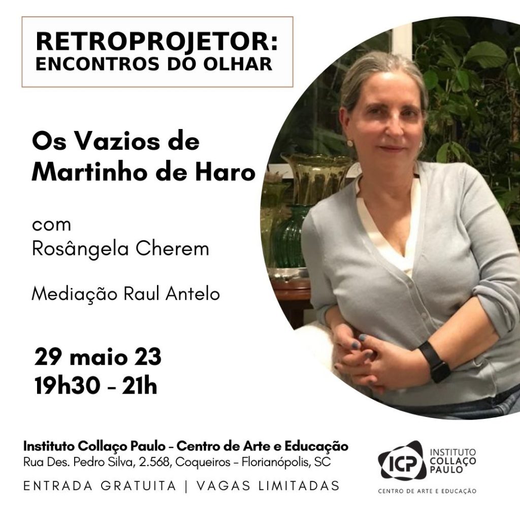 Comprometido com arte educação, o intercâmbio entre especialistas de artes visuais e a partilha de conhecimento, desde a sua criação, em julho de 2022, o Instituto Collaço Paulo mantém contato com Antelo na perspectiva de realizar programas para aprofundar o entendimento sobre as exposições. “Retroprojetor: Encontros do Olhar”, portanto, entrecruza duas agendas do ano, a mostra “Indivisível Substância: Martinho de Haro e Florianópolis” e a próxima exposição, uma individual sobre Elke Hering que abre no dia 20 de julho. Produto cultural totalmente patrocinado pela Prefeitura de Florianópolis por meio da Lei Municipal de Incentivo à Cultura (modalidade doação), o projeto expositivo de Martinho conta com o apoio das empresas Dígitro e Ibagy e possibilita uma agenda de encontros e reflexões sobre o artista.