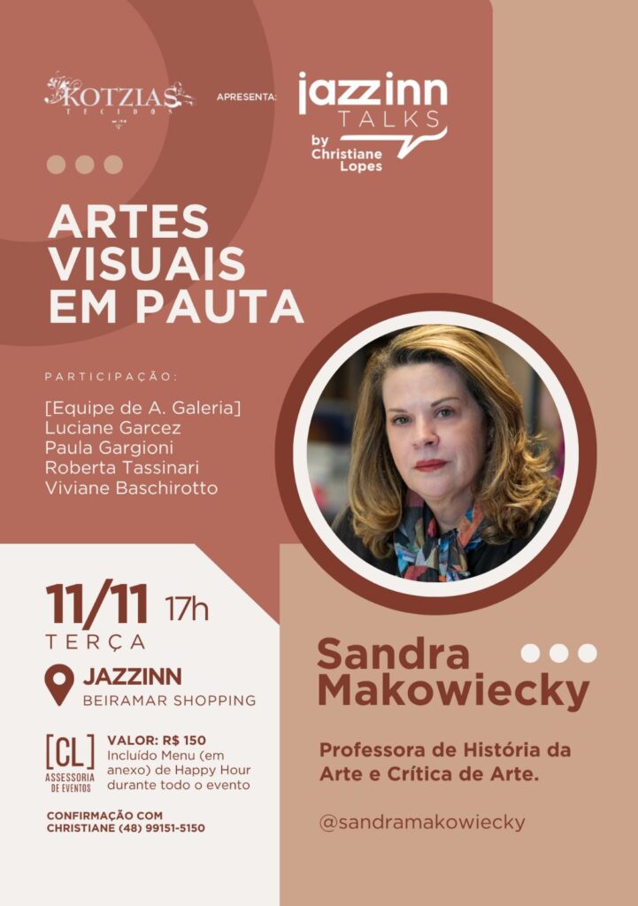 Sandra Makowiecky, integrante do conselho fiscal do Instituto Collaço Paulo – Centro de Arte e Educação, é a convidada do Jazzinn Talks, programa comandado por Christiane Lopes Vieira, no Jazzin Gastro Bar. A conversa “Artes Visuais em Pauta” no dia 11 de novembro, a partir das 17 horas, versará sobre as suas atividades como coordenadora no Passeio Cultural Primavera, a contribuição no instituto, e o pensamento da professora titular aposentada do Programa de Pós-Graduação em Artes Visuais da Universidade do Estado de Santa Catarina (Udesc).