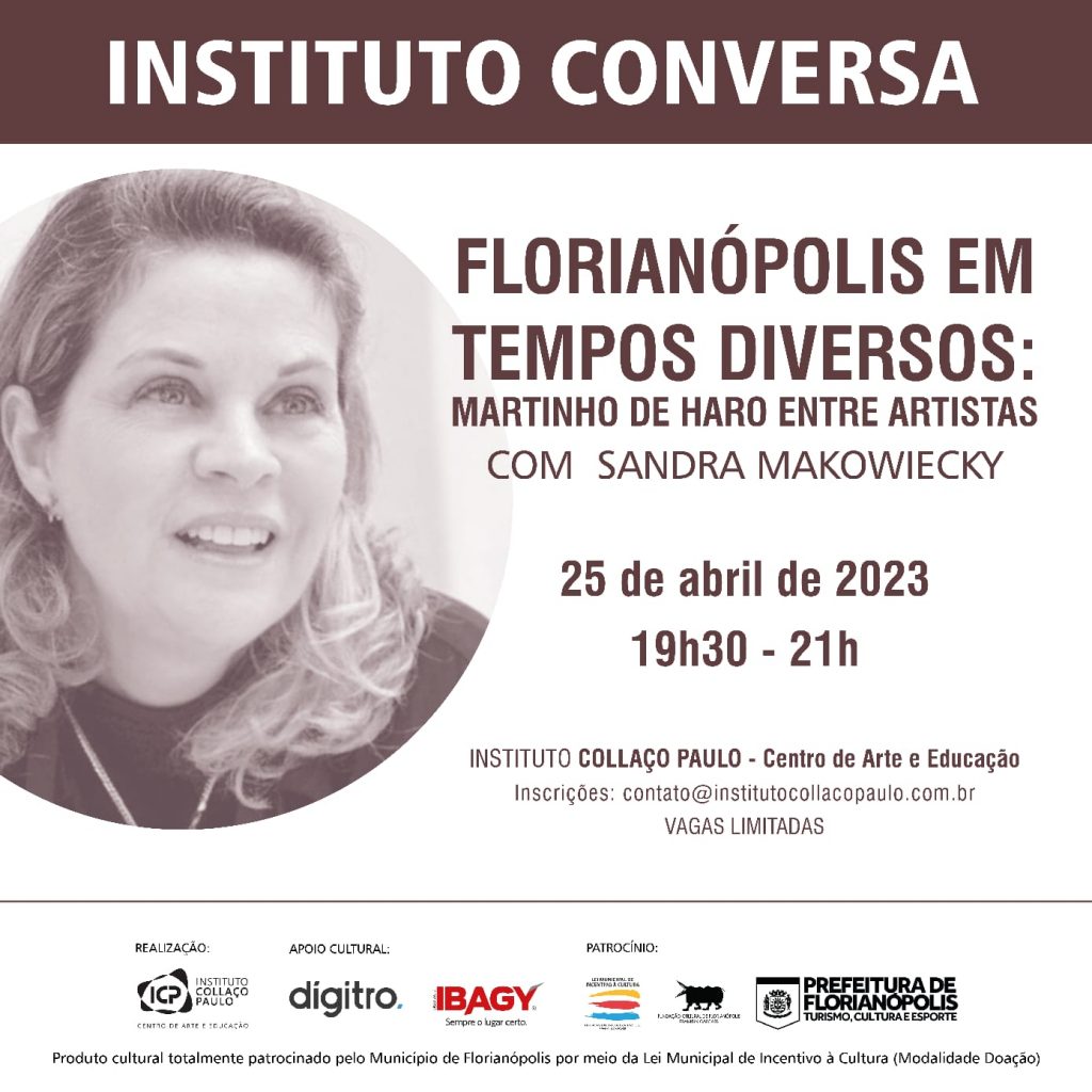Dia 25, às 19h30, o programa Instituto Conversa recebe uma outra autoridade nas relações entre as artes visuais e a cidade de Florianópolis. Doutora e professora, Sandra Makowiecky faz a abordagem “Florianópolis em Tempos Diversos: Martinho de Haro entre Artistas”.