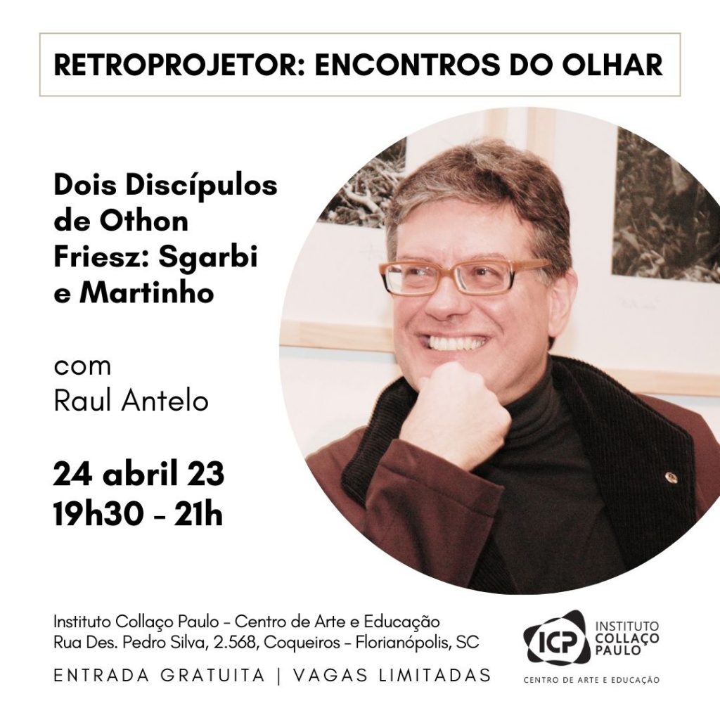 Na segunda, dia 24, às 19h30, o conferencista, pesquisador, professor, autor de livros, Raul Antelo abre o programa Retroprojetor: Encontros do Olhar, seis conferências que ele idealizou para a instituição e que ocorrerão entre abril e setembro. O primeiro encontro tem Antelo como destaque para fazer a abordagem “Dois Discípulos de Othon Friesz: Sgarbi e Martinho”.